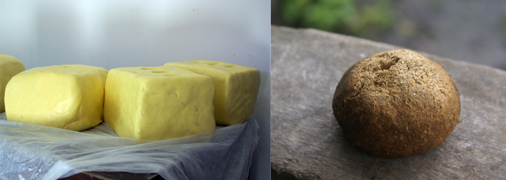 珞巴族各部落的食物大多以谷類為主,主食有玉米、雞爪谷、粟米、青稞、高粱、蕎麥等,尤以玉米、雞爪谷為主。另外,“達榭”和“達薺”也是許多珞巴族部落主要的食物來源。“達榭”和“達薺”是淀粉含量很高的野生植物,經過較復雜的加工,能提取出淀粉,即人們日常食用的達榭粉,食用方法仍是調成糊狀或者烙餅。除了上述的主要食物外,珞巴族人還愛吃一些植物根莖,如土豆、山芋等,一般放入火塘中烘烤或者煮食。