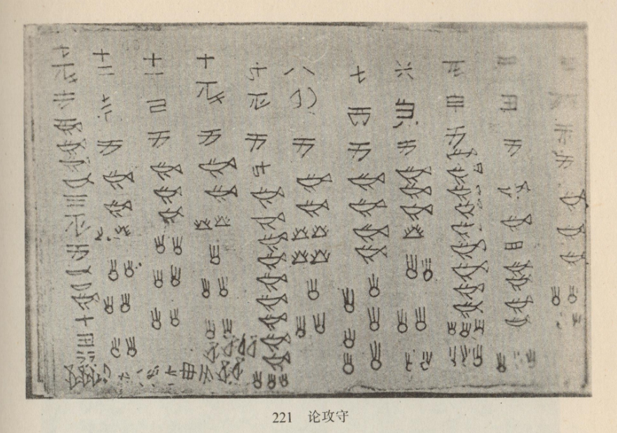 水書抄本。寫于清嘉慶年間,共20頁,長18厘米,寬27厘米。以竹簽作筆蘸墨書寫。內容述戰爭陣法。中圖魚形表示守方,方框為指揮位置,三角形表示山頭陣地,圓圈加三畫表示進攻之敵敗退形象。原件存北京圖書館。