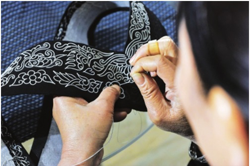 第三步是繪制圖案,即在做好的布?xì)ど侠L畫出刺繡所參照的圖案,這是制作馬尾繡的關(guān)鍵環(huán)節(jié)。其花樣繁多,精細(xì)而復(fù)雜,繪畫的好壞直接影響到馬尾繡的精美程度。