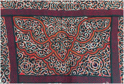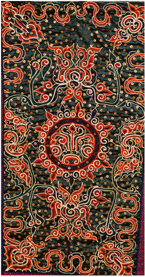而在背兒帶下部的中心圖案則是一個古老的傳統(tǒng)紋樣。主體形象以同心圓為主,里面的幾何裝飾圖案依次向外擴(kuò)散,就像太陽的光芒一樣向四周散射。圓是一個太陽,里面有一棵樹,即小孩的生命樹,寓意生命之樹長青,樹上有一顆石榴花,寓意多子。太陽周圍彩帶狀紋樣代表雷鳴與閃電。雷神的地位在水族社會中是至高無上的,能主持正義、懲惡揚(yáng)善。背兒帶上繡雷鳴便是祈求雷神對幼兒的庇佑。太陽紋與雷神的象征圖案組合,是水族自然神崇拜信仰的寫照。太陽圖案上下繡有兩只大蝴蝶,左右各繡一只老鷹。下部的四角是葫蘆紋,葫蘆的形象源于水族的創(chuàng)世神話。天地初始之時洪水泛濫,作為水族先人的兄妹二人為了躲避洪水,棲身于一支大葫蘆中,直至洪水退去。兄妹二人走出葫蘆,結(jié)為夫妻,繁衍生息,才有了今日成千上萬的水族兒女。于是,葫蘆被賦予了繁衍、生殖的意義。