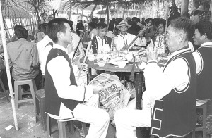 我在婚禮的頭一天趕到新娘家。下午4點,村里人就劈柴的劈柴,搭灶的搭灶,殺豬宰鴨,忙得不亦樂乎。村里人告訴我,按照黎族的習慣,不管是誰家有事,全村人都要來幫忙,而且一夜都不睡覺。活干累了就開始吹拉彈唱,歇一下再接著干,直到天明。的確,這一夜完全是黎家人的勞作聲和樂曲聲伴我入眠的。