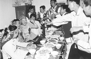 接著婚宴開始,八音隊吹奏的樂曲優美動聽,大家喝喜酒祝賀新郎、新娘;同時,男方家的帶娘給女方家人開檳榔碗。開檳榔碗的順序是女方家人由老到小分別接檳榔碗,意在感謝女方長輩、親屬對新娘的養育之恩。
