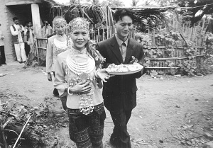 上午10點,新娘要“回返”娘家。伴娘挑著兩只籮筐,一邊放有糯米和豬肉,另一邊放著一件衣服。這件衣服只能是黑色或藍色,不能是花色和白色。據說花衣服新娘穿了會花心,白色則不吉利。這件衣服是婆婆特地送給新娘的,今后一定要穿。新娘和伴娘一起走在回返的路上,新娘舍不得離開婆家,走到村口,就把糯米飯和豬肉分給過路人吃,以示新娘的熱情好客。我也吃了籮筐里的糯米飯和豬肉,覺得很香,很好吃。之后,新娘和伴娘不再往娘家走,而是返回了婆家。