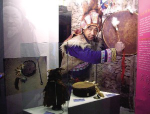 在民族文化宮的展覽中,有一幅大照片——一位老釋比,手拿羊皮鼓,頭戴猴皮帽,表情莊嚴、凝重。那正是釋比傳人朱金龍。朱金龍這次也來到了北京,把他祖祖輩輩傳下來的釋比文化展現給北京的觀眾。