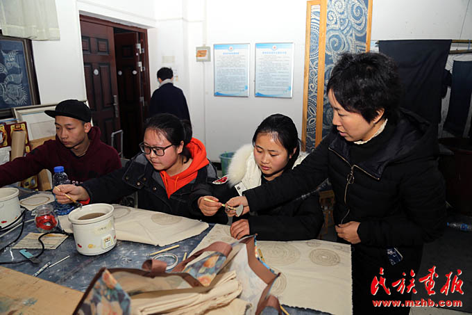 吳安麗老師(右一)在凱里學院藝術學院蠟染實訓室指導學生