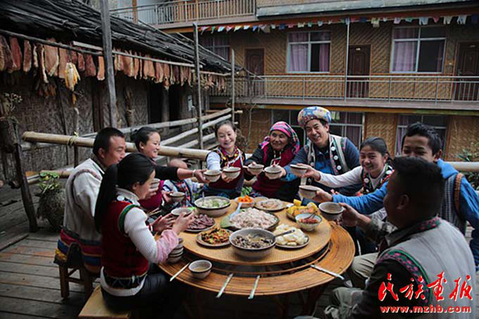早上,老姆登村73歲的怒族老人斯普早早起來招呼兒子郁伍林、兒媳魯春花:“春節快放假了,客棧的生意會忙得不可開交,趁著現在客人不多,家里人先吃一頓團圓飯吧。”斯普老伴早年過世,7個兒女中老五郁伍林在身邊照顧她。“過去在春節才能吃上一頓好飯菜,也要準備很長時間,現在每天都有好吃的,天天在過年,多虧了黨的好政策。”說起今天的幸福生活,生在舊社會的斯普感慨萬千。