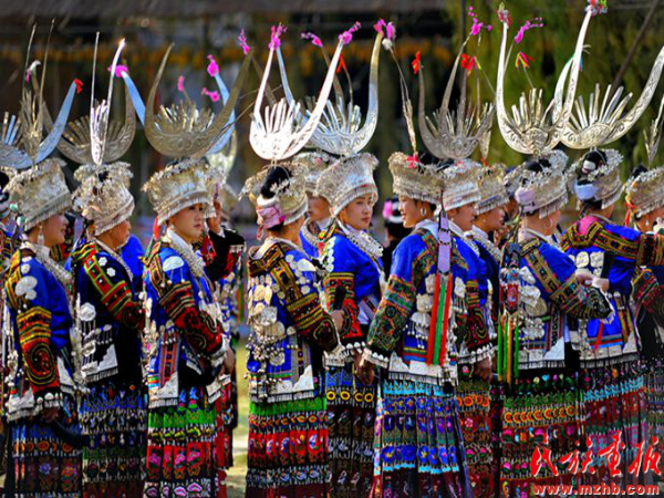 過苗年的時候,貴州苗族未婚少女穿戴起了體現家庭財富的銀飾