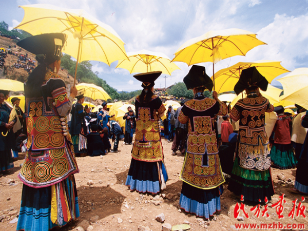 四川涼山彝族婦女的衣裙上繡滿黃色花朵
