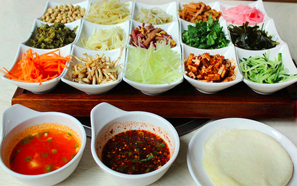 制作方法:烙。面粉加水,鹽少許揉勻搟透(水與面粉比例為1:6),平鍋燒熱刷油、擦干,然后左手抓起面團甩圓并向鍋底杵一下成為直徑為9厘米的圓薄皮時,右手立即把圓形面皮揭起,這樣制作數(shù)十張春卷皮,放入蒸籠稍蒸一下使其回軟,便于包食。再將綠豆芽、海帶絲、芹菜節(jié)、蕨菜節(jié)用開水氽過,分別裝入小盤中,小碗內放入醬油、醋、味精、麻油、姜沫、蔥花、辣椒兌成汁。春卷皮中放入各種素菜絲包成上大下小的兜形,放入酥黃豆或油炸花生,澆淋兌好的辣椒汁即成。