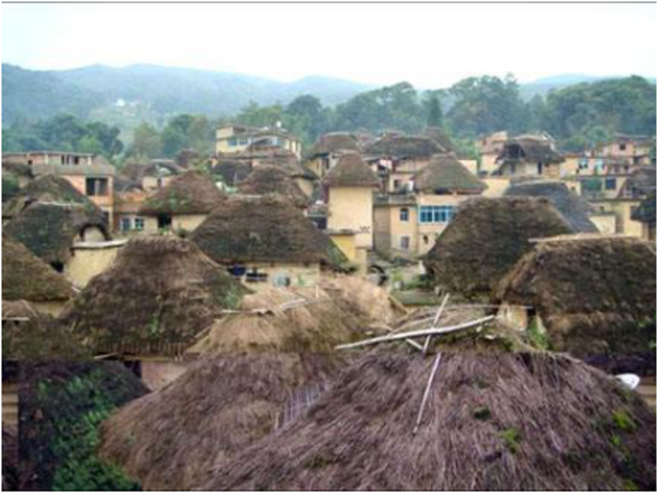 哈尼族一個核心的家庭的一幢完整的磨菇房,包括正房、左右廂房、庭院和圍墻等數個建筑單元,家中配有腳碓、石磨、水缸、織機、藍靛染缸、犁、耙、刀、斧、鋤、籮和火塘等生產生活設施,滿足作為社會生產和生活單位的家庭的諸多需求。若干家庭的磨菇房逐次排列,就逐漸變成了一個哈尼族山寨的磨菇房群落。