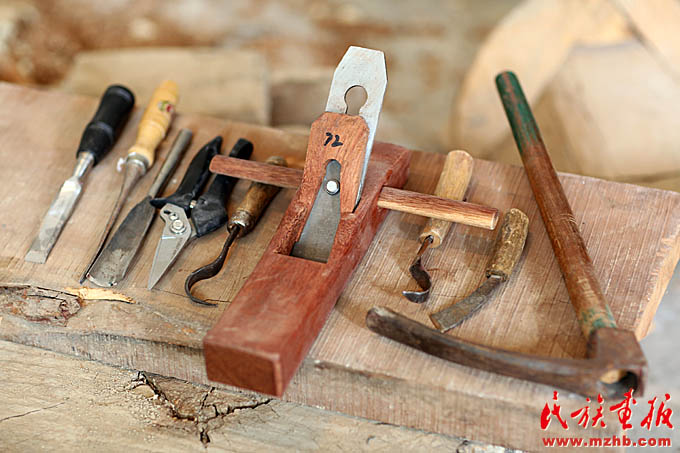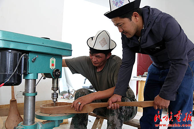 這間工作室的主人叫阿吉別克·買買達洪,主人恰巧有事外出,他的弟弟,年輕朝氣的吾蘭別克張羅著給記者們當起了翻譯。正忙活著打磨樂器的小伙叫木沙,今年31歲,問起庫姆孜的制作工藝,他才把頭抬起來,笑著說:“我做這個十年了。一把庫姆孜,往往琴身是杏木,蓋子是松木。杏樹、松樹木切割后放在干燥的地方,一兩年后才能用。”庫姆孜有三根弦,琴弦以前用動物的腸子手工自制,現(xiàn)在有的工匠開始使用現(xiàn)成的弦。判斷庫姆孜手工藝人手藝高低的關鍵何在?木沙解釋說,“要看彈出來的聲音。木頭的原料不同,出來的聲音也不同。”這個回答似乎也隱藏了手工藝人的絕活所在,可意會不可言傳的技藝,往往在一代代的工匠手中以師徒親授的方式傳承。