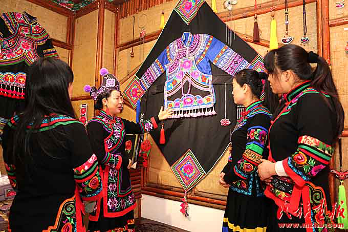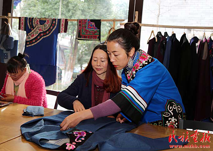 大姚縣咪依嚕民族服飾制品有限公司總經理羅珺給職工講解彝族服飾文化