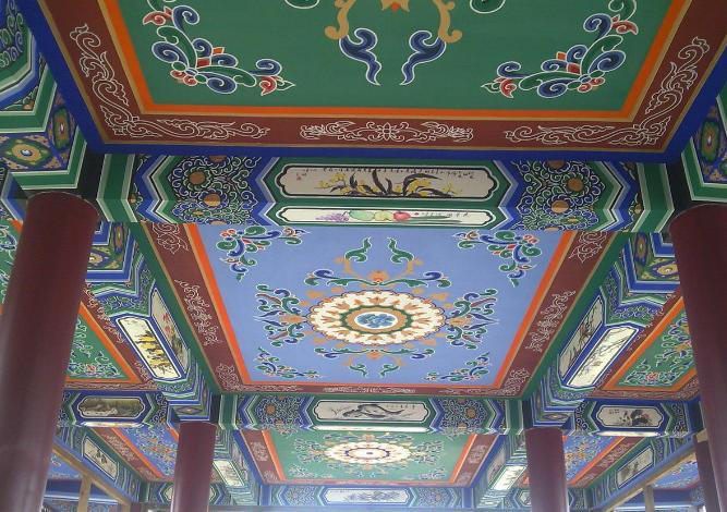 彩畫(huà)著色是一項(xiàng)關(guān)鍵的工序,不能有半點(diǎn)差錯(cuò)。工匠們?yōu)椴煌伾O(shè)定了代號(hào),一米色、二淡青、三香色、四硝紅、五粉紫、六洋綠、七佛青、八石黃、九紫色、十黑煙、十一紅等。將代號(hào)直接寫(xiě)在地仗上,然后根據(jù)色號(hào)將各種色料對(duì)號(hào)入座,涂刷著色一、二遍,待干后再刷一遍光油罩光,以起保護(hù)作用。彩畫(huà)所用色料一般均為各色成品油漆。