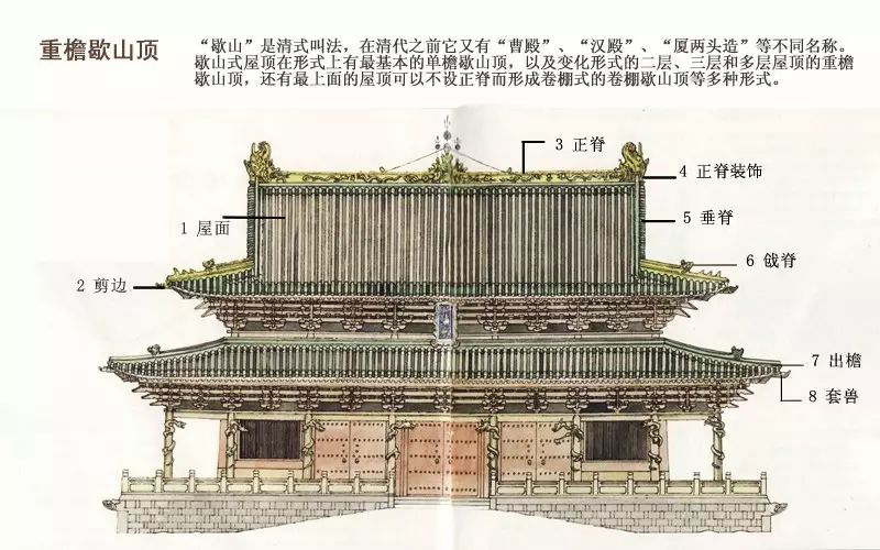 歇山頂的等級僅次于廡殿頂。它由一條正脊、四條垂脊和四條戧脊組成,故稱九脊殿。其特點是把廡殿式屋頂兩側側面的上半部突然直立起來,形成一個懸山式的墻面。歇山頂常用于宮殿中的次要建筑和住宅園林中,也有單檐、重檐的形式。如北京故宮的保和殿就是重檐歇山頂。