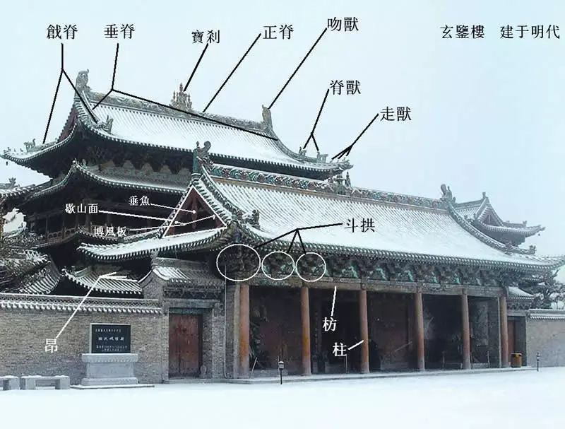 5. 垂脊:在廡殿頂、懸山頂、硬山頂建筑中,除了正脊之外的屋脊都叫做“垂脊”。而在歇山頂建筑中,除了正脊和戧脊外的屋脊都叫做“垂脊”。垂脊都是沿著山面的博風板走勢下垂。