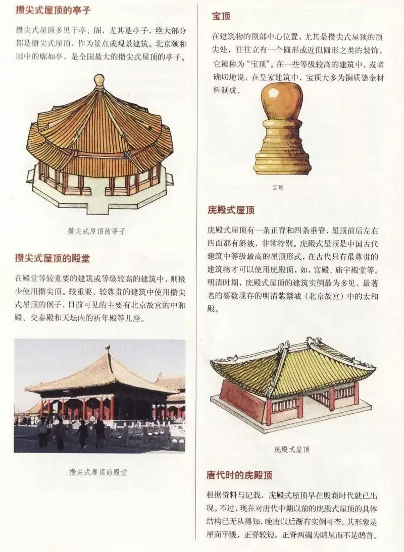 無正脊,只有垂脊,只應用于面積不大的樓、閣、亭、塔等,平面多為正多邊形及圓形,頂部有寶頂。根據脊數多少,分三角攢尖頂、四角攢尖頂、六角攢尖頂、八角攢尖頂。此外,還有圓角攢尖頂,也就是無垂脊。攢尖頂多作為景點或景觀建筑,如頤和園的郭如亭、麗江黑龍潭公園等。在殿堂等較重要的建筑或等級較高的建筑中,極少使用攢尖頂,而故宮的中和殿、交泰殿和天壇內的祈年殿等卻使用的是攢尖頂。攢尖頂有單檐、重檐之分。