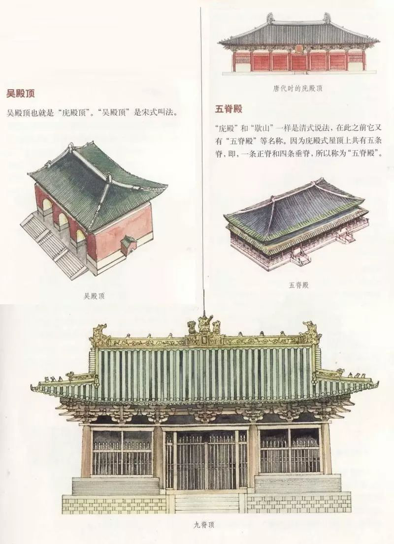 其中廡殿頂最早,約出現于先秦時期。在商代的甲骨文、周代銅器、漢畫像石與明器、北朝石窟中都有反映。據《周禮·考工記》載:“商人四阿重屋”,即早在商朝,已有四阿屋頂,但只是四坡水的茅草房而已。