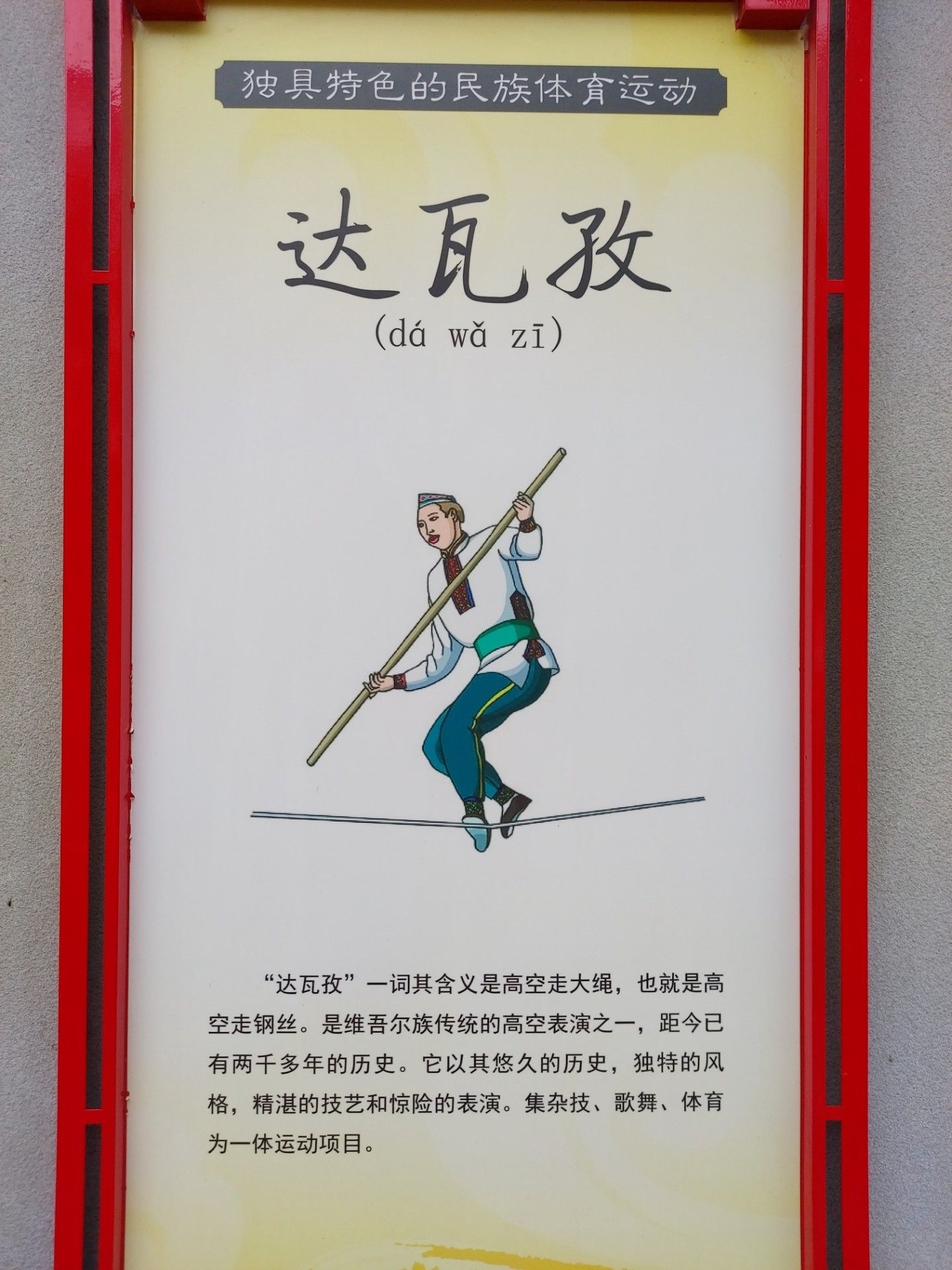 “達瓦孜”一詞其含義是高空走大繩,也就是高空走鋼絲。是維吾爾族傳統的高空表演之一,距今已有兩千多年的歷史。它以其悠久的歷史,獨特的風格,精湛的技藝和驚險的表演。集雜技、歌舞、體育為一體運動項目。