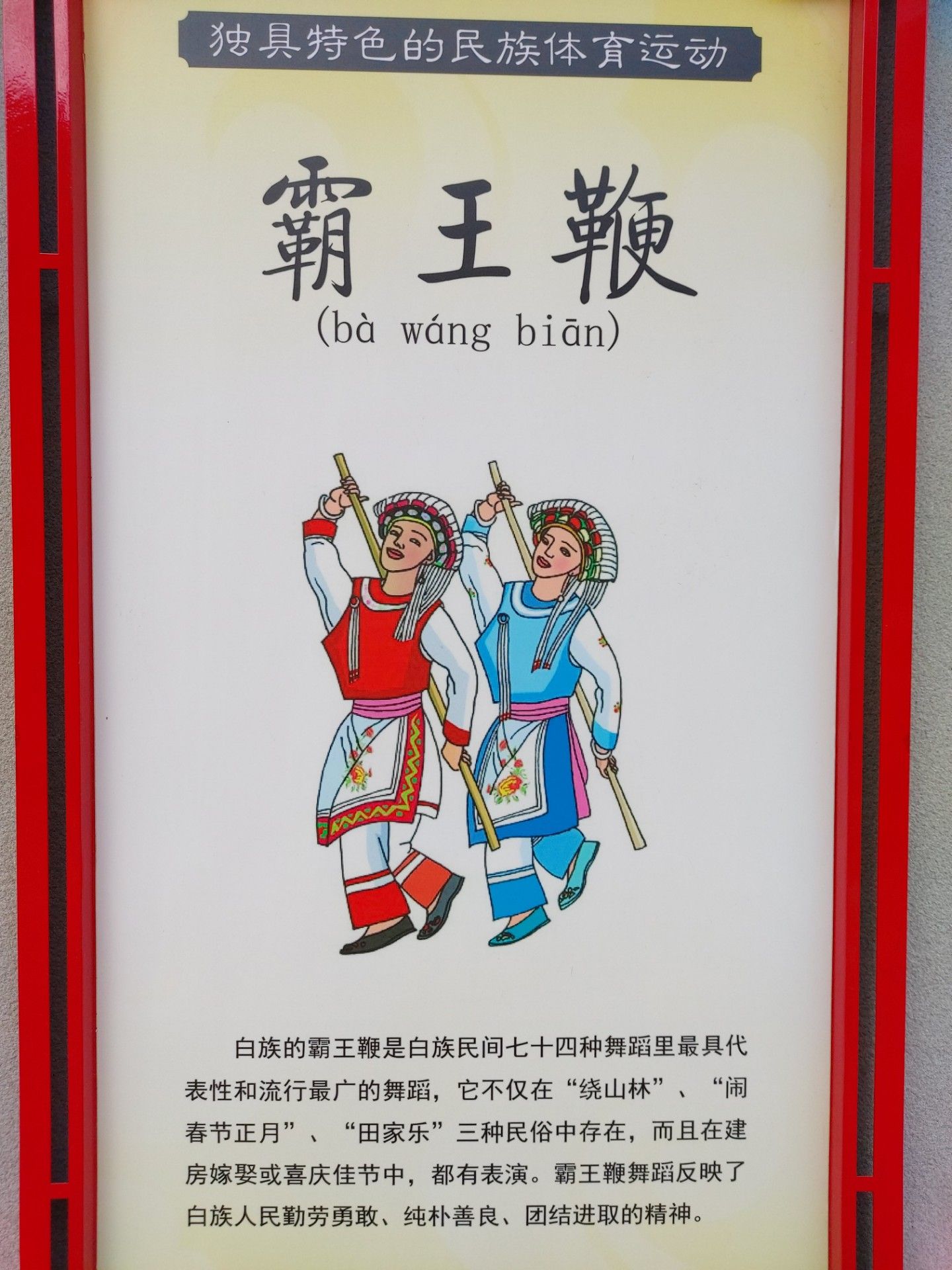 白族的霸王鞭是白族民間七十四種舞蹈里最具代表性和流行最廣的舞蹈,它不僅在“繞山林’”、“鬧春節(jié)正月”、“田家樂(lè)” 三種民俗中存在,而且在建房嫁娶或喜慶佳節(jié)中,都有表演。霸王鞭舞蹈反映了白族人民勤勞勇敢、純樸善良、團(tuán)結(jié)進(jìn)取的精神。