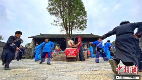 圖為12月14日彭承金正在為擺手舞擊鼓 周星亮 攝