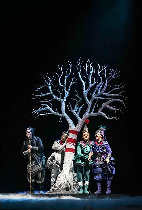 歌劇《小河淌水》在舞美、服裝、燈光,特別是音響方面都有其特色與成功之處。劇中并沒有追求奢華的舞美,而是以簡潔與流暢的方式彰顯了民族特色,取得了較好的藝術效果。