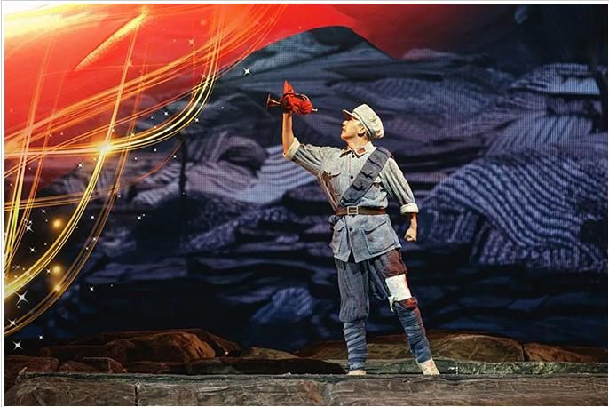 《花兒與號手》是一部以紅軍長征路過六盤山為背景創作的音樂劇,全劇展現了長征路上紅軍戰士的理想信念和“長征是宣言書、是宣傳隊、是播種機”這一核心思想,弘揚了中國共產黨百年征程中展現出的無私無畏的革命精神。