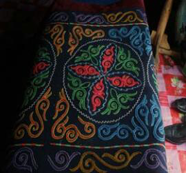 北方少數民族地區都沒有養蠶的條件,所以用于刺繡的絲線都需要與中原的物品交流當中索取,這也是在蒙藏地區有用各色的布出現貼花的原因。科爾沁貼花就是把各式各樣布料剪成紋樣貼在布底上再經過縫邊,鎖邊而成的一種刺繡種類。這種貼繡在科爾沁蒙古族中是很普及的一種形式。這種貼繡能較好地運用大塊面的色彩,用料簡單,是刺繡中常用的一種方法。科爾沁刺繡在面料上刺繡圖案時用三種方法,第一種是把刺繡的圖案畫在紙上在把紙樣按照輪廓剪下來,然后放在要繡的底樣上,按照紙樣的輪廓進行刺繡。第二種方法是把圖案如實地在錦緞上描下來進行刺繡。第三種是直接在錦緞上自由發揮,繡出各種圖案。