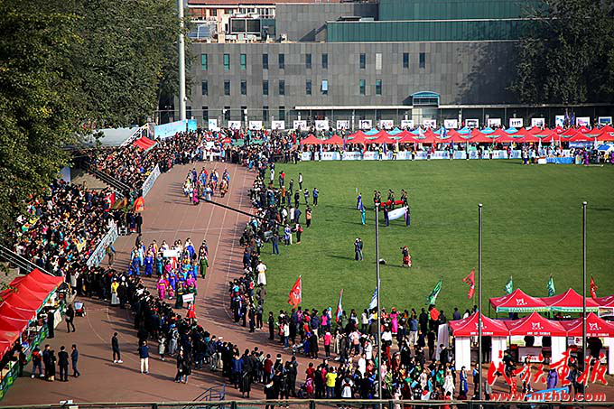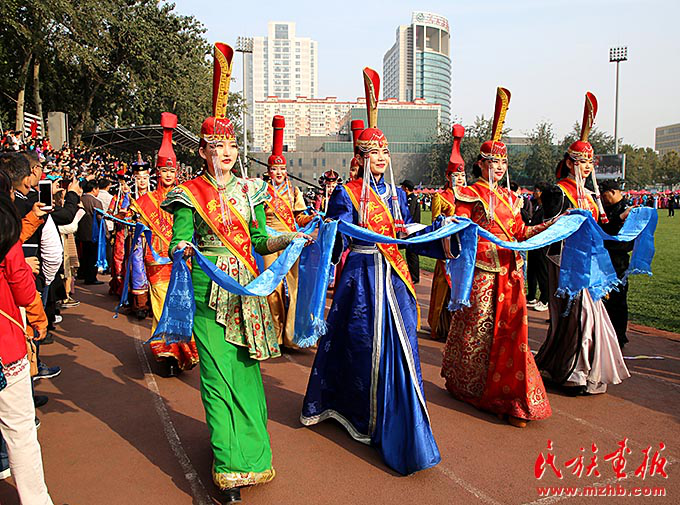 開幕式上,發起并組織“首屆在京蒙古族那達慕大會”的原中央民族學院民語系77級蒙古語班方隊通過主席臺