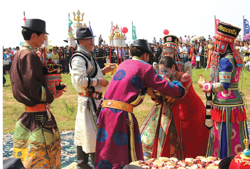 在蒙古民族人生禮儀中,其婚禮儀式最為隆重、熱烈,充滿草原文化綜合特征。蒙古人婚禮習(xí)俗經(jīng)歷了從最早的原始群婚、偶婚到后來(lái)一夫一妻婚姻制度的發(fā)展過(guò)程。至13世紀(jì),蒙古人的婚禮習(xí)俗已趨完整?!睹晒琶厥贰份d,鐵木真九歲時(shí),其父耶速格巴圖爾(漢書(shū)譯作“也速該把禿兒”)帶他與翁吉刺惕的德·薛禪之女勃兒帖定親時(shí)就有許多規(guī)矩。
