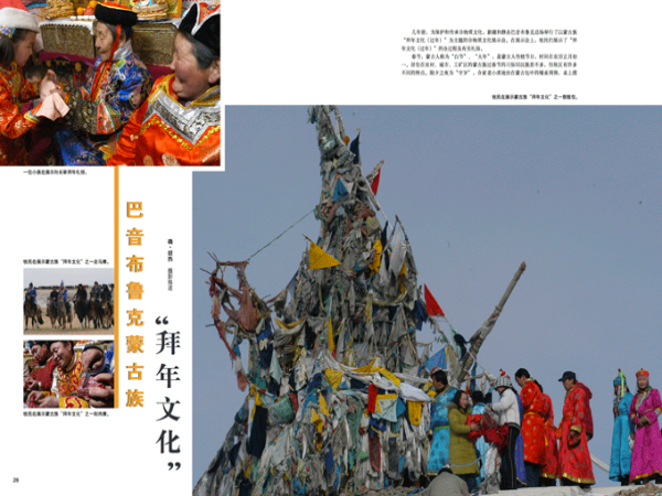 幾年前,為保護和傳承非物質文化,新疆和靜縣巴音布魯克總場舉行了以蒙古族“拜年文化(過年)”為主題的非物質文化展示會。在展示會上,牧民們展示了“拜年文化(過年)”的全過程及有關禮俗。