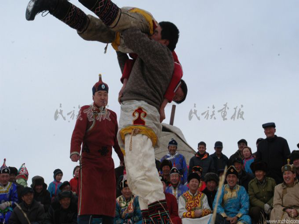 春節,蒙古人稱為“白節”、“大年”,是蒙古人傳統節日,時間在農歷正月初一。居住在農村、城市、工礦區的蒙古族過春節的習俗同漢族差不多,但牧區有許多不同的特點。除夕之夜為“守歲”,合家老小席地坐在蒙古包中的矮桌周圍,桌上擺著一盤盤香噴噴的肉類、奶食品,以及糖果、香煙、美酒等物,有的還要在矮桌上供一張大紙,紙上寫著祖先的名字。午夜,開始飲酒吃年飯,或吃除夕餃子。按規矩團圓之宴要多吃多喝酒、肉,食器要擺滿滿一席。如吃不完也要剩得越多越好,象征新的一年里吃喝不盡、年年有余。家里的年輕人,要向長者敬“辭歲酒”。特別有意思的是全家共吃一塊由酥油、糖、白面烙成的大圓餅,這叫吃新年餅,每人只吃一口,意思是全家永不分離,永久團圓,永遠過甜甜蜜蜜的日子。除夕之夜要耍“嘎拉木”(玩羊骨頭)、說書、唱歌、跳舞,通宵達旦,熱鬧一宿。過大年,按習慣還要拜年,大年三十晚上為辭舊歲禮, 初一早上為迎新年,晚輩給父母和老人叩頭、敬酒、獻哈達,祝老人們身體健康,晚年幸福!老人擁抱孩子們,并斟上一碗鮮奶,祝愿子女們幸福,像牛奶一樣純潔。大年初一早餐后,男女盛裝,三五成群來到浩特(村鎮),挨家串戶給親友拜年。客人進屋首先向長輩叩頭拜年,祝愿老人身體健康,年豐人壽。按習慣由主人家的女婿向客人逐個敬酒,每敬必喝,或邊喝邊唱,邊唱邊舞。