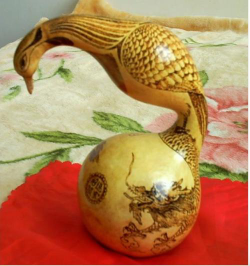 葫蘆雕集繪畫、書法、篆刻藝術(shù)于一體,傳承和發(fā)展了我國傳統(tǒng)“葫蘆文化”。甘肅的雕刻葫蘆最早出產(chǎn)于蘭州,距今約100多年,據(jù)說早期的蘭州雕刻葫蘆比較簡(jiǎn)單,對(duì)葫蘆不會(huì)做刮皮、磨光等加工處理,也不填色;只是在葫蘆表皮雕刻出山水、風(fēng)景或戲劇人物,作為兒童的玩具,在街頭巷尾出售。到了清代光緒年間,秀才蘭州人李文齋對(duì)葫蘆雕刻工藝做了改進(jìn)。他針對(duì)當(dāng)時(shí)雕刻表面粗糙、題材單調(diào)的弊端,首先將葫蘆原生表皮刮去、磨光,并用鏹水混合燃料,染成紅黃二色,是雕刻的景物不易脫落;其次,擴(kuò)大圖案創(chuàng)作題材,在原有山水、花草等圖案基礎(chǔ)上,增加了如《桃花源記》、《蘭亭集序》、《竹林七賢》等歷史文化和神話故事,形成了圖文并茂的題材格局;最后是在雕刻工具上采用了以針代刀,使圖案形象更加情景交融,栩栩如生。其雕刻葫蘆的特點(diǎn)主要是求其意態(tài)之美,追求神似;人物寥寥數(shù)筆,山水花卉濃淡相宜,形神兼具,求其風(fēng)雅;題款文字、細(xì)如蚊足,點(diǎn)綴成行,瀟灑自如。