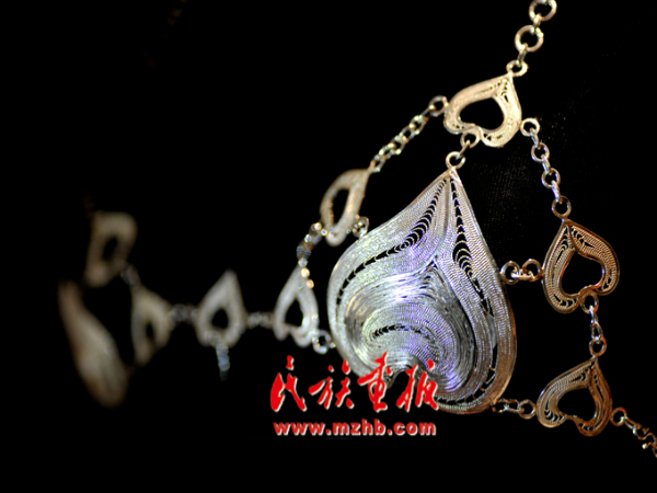 在龍太陽的作品“蝶戀花”上,我們看到了蝴蝶的紋樣。苗族人相信,“蝴蝶媽媽”是所有苗族人共同的祖先。因為苗族沒有文字,他們便將記憶傾注在銀飾中。