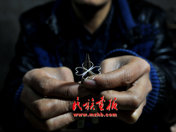 將事先手工打磨好的銀絲擺放在需要鑲嵌的位置,然后用焊槍整體加溫。該過程需要嚴格控制溫度,溫度高則熔斷銀絲,溫度低則鑲嵌不牢固。制作過程最難把握的是鏨刻與焊接。鏨刻的掌握全憑手上的感覺,用力過大容易將銀片鏨通,力道不夠又不能將紋理的層次感突顯,這是檢驗一個銀匠師傅技藝是否成熟的標準之一。
