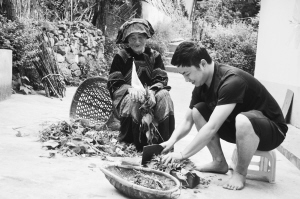 駐村干部(右)幫助村里老人干家務活