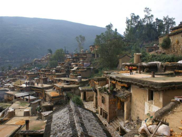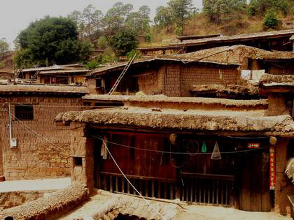 彝族是農牧兼營的民族,村寨的分布與坐落有其獨特的傳承。彝族的村寨多坐落在海拔2000~3000米的山區、半山區,相沿聚族而居。為適應西南地區亞熱帶氣候和山地特點,彝民們便就地取材,以一種最容易、最節省錢財人力的建房方式,創造出中國建筑的獨特樣式——土掌房。土掌房多建于山地斜坡上,以石為墻基,用土坯砌墻或用土筑墻,墻上架梁,梁上鋪木板、木條或竹子,上面再鋪一層土,經灑水抿捶,形成平臺房頂,不漏雨水。有的大梁架在木柱上,擔上墊木,鋪茅草或稻草,草上覆蓋稀泥,再放細土捶實而成。