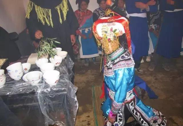 2、源自于民族歌舞文化習俗。彝族是個能歌善舞的民族,自古就有以歌作媒,用歌表達對異性的愛慕和追求的傳統。相傳,彝族先祖篤彌時,洪水淹沒了世界,而篤彌按照天神策舉祖的授意,躲進自造的木桶中幸免于難,成了世間的獨人。天神為了不讓人種在世間滅絕,于是就安排天上三仙女尼友咪比、婁友咪多、吞友武吐下凡到人間,在唄谷懇嘎這地方設歌場,與篤彌唱歌又跳舞,談情又說愛。整個歌場上,熱鬧不一般:天上的仙女,成群來歌場;野人拿舞具,老虎打燈籠;人熊吹蘆笙,歡聚在歌場。彝族的先祖,就是通過歌舞迎得了仙女的歡欣的而成就婚姻而繁衍了彝人的。從此,彝族青年談情說愛、談婚論嫁,都離不開歌舞。歌舞逐漸地融入了婚禮場中,與婚禮上的各種儀式進行對接和植入,通過上千年的發展,就形成了“阿買懇”。“阿買懇”中的“阿買”指未婚女子,“懇”有“歌舞”、“跳舞”之意。如“唄谷懇嘎”中的“懇嘎”就是歌舞場壩的意思;“懇合”(鈴鐺舞蹈)中的“懇”也有跳的意思;還有“懇咪”,指的是關于歌舞的詩文。可見,“懇”(歌舞)的內容是相當豐富的,因而彝族出嫁時有出嫁歌,這完全是在情理之中的。
