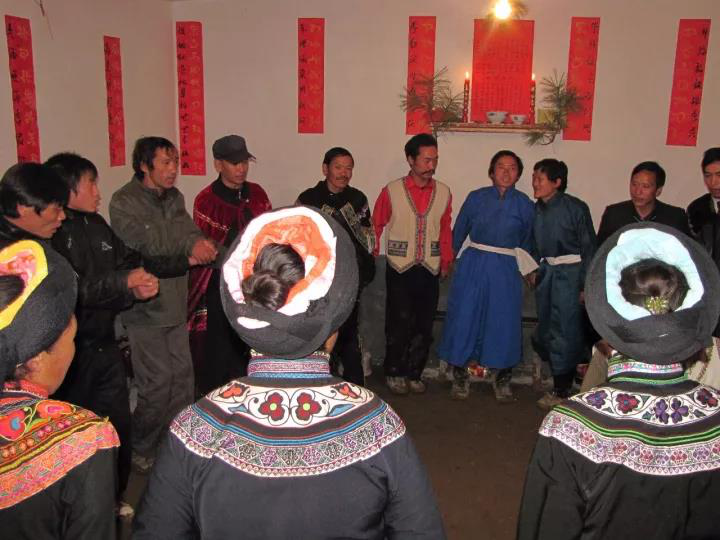 3、源自于宗法禮教。在阿買懇的唱詞中,有阿買懇是君長制定的規矩之說,根據彝族典籍文獻記載和民間傳說,反映古代彝族水西君長家和烏撒君長聯姻嫁娶時,都興阿買懇,說明阿買懇是君長興起這一說法是由根據的。彝族是一個很重視宗法禮教的民族,各種禮儀習俗和規章制度比較細密而嚴格,作為人生重大禮儀的婚儀,必然有許多規矩,阿買懇的幾十項程序性對答吟誦,就足以說明了這一點。但它也并非完全是“君長制定的規矩”,它更多的是百姓的禮俗和情趣,因為,在阿買懇唱詞中反映的勞動場景的內容很多。實事求是的講,阿買懇應該是由君長所倡導和認可,由廣大彝族民眾興起,經布摩和民間歌師共同創作、經民眾在演唱過程中反復修訂而形成的。