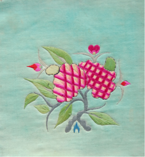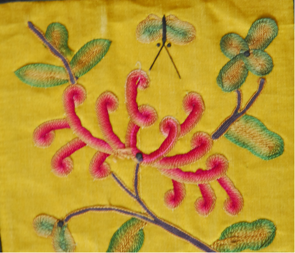 1.平針繡,又稱“直針”,是滿族枕頂刺繡最基本的針法之一,它能準確地表達植物花卉、動物禽獸、人物、器物等。在所有針法中,平針是分布最廣、使用范圍最大的針法。它的運針方式是起針、落針都在圖案的輪廓邊緣,針腳排列均勻,線跡平行,不重疊交錯,紋樣之間的線條靠空出地面來表現。