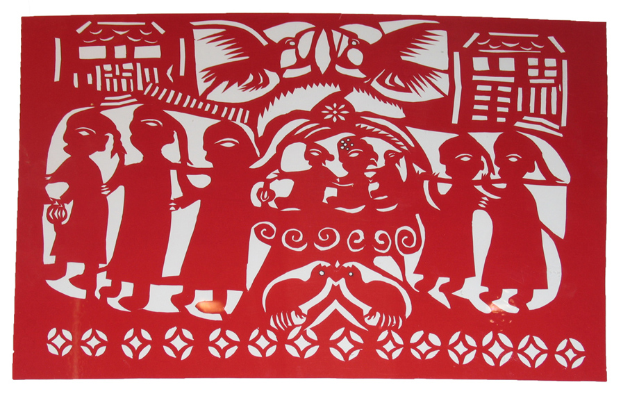 其實,這樣一種民間工藝,早在清代,就已堂而皇之地登上了朝廷大雅之堂。如皇帝舉行婚禮作洞房的神寧宮,墻壁就按滿族習俗裱紙,四角貼著雙喜字剪紙角花,頂棚中心貼著龍鳳團花剪紙。在宮殿兩旁的過道壁上也貼有角花。據說有人用紙剪成有鹿、鶴、松的“六合春”圖案,加以彩繪,貼于朝服覲見慈禧太后,連她都以為是繡出來的。