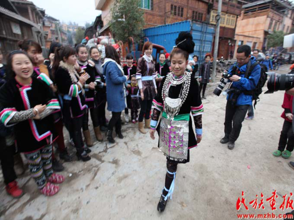 新娘走秀和鬼師做法是婚禮儀式的一項主要內容。新娘走秀在第一天上午九時舉行,這是新娘唯一向眾人展示自己的機會也是婚禮中最為隆重的儀式,這時街心廣場及道路兩側擠滿了看熱鬧的群眾。之前新娘們都要精心打扮一番,穿上嶄新漂亮的傳統衣裙,戴上各種銀飾,然后在親人的目送下離開家門。新娘走秀與漢族結婚的迎親有很大不同,沒有新郎伴娘的陪伴,更沒有車水馬龍的迎親隊伍,只是一人獨身前行。鬼師做法在新娘登場后進行,我們只是見到了鬼師做法后留下的一些物品。