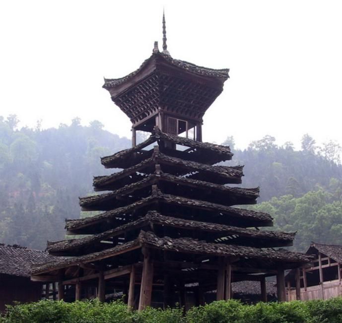 看這一座座高聳入云的鼓樓,氣勢十足,這是侗寨的標志性建筑,爬上鼓樓最頂端,便可在侗寨中“一覽眾山小”。鼓樓的造型為杉樹,最初為“遮陰樹”。古時在樹蔭下聚會議事歌舞娛樂,但樹蔭不避風寒。勤勞智慧的古人便仿杉樹形狀在寨中建起“堂瓦”,雨能避濕,冷能避寒。
