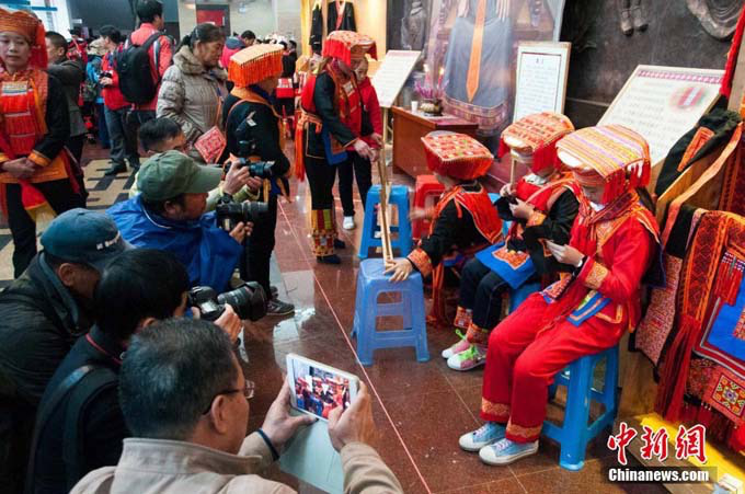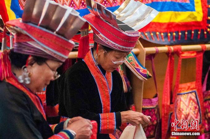 12月6日,在中國瑤族之鄉廣西金秀瑤族自治縣的盤王節上,當地瑤族百姓展示瑤族織繡