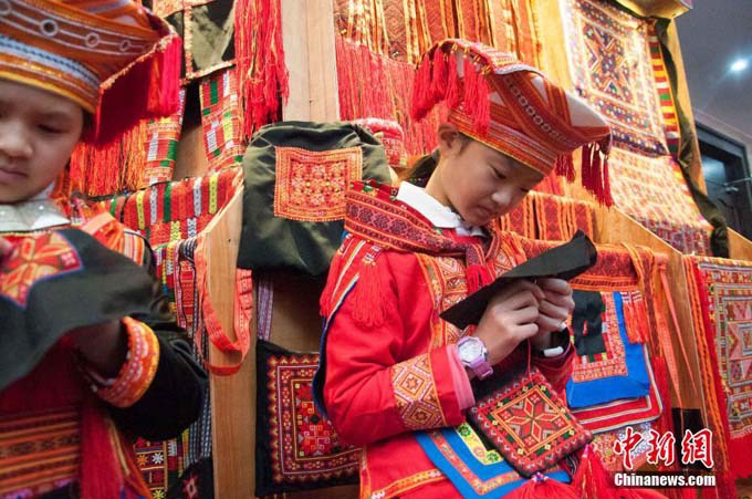 12月6日,在中國瑤族之鄉廣西金秀瑤族自治縣的盤王節上,當地新一輩瑤族女孩展示瑤族織繡