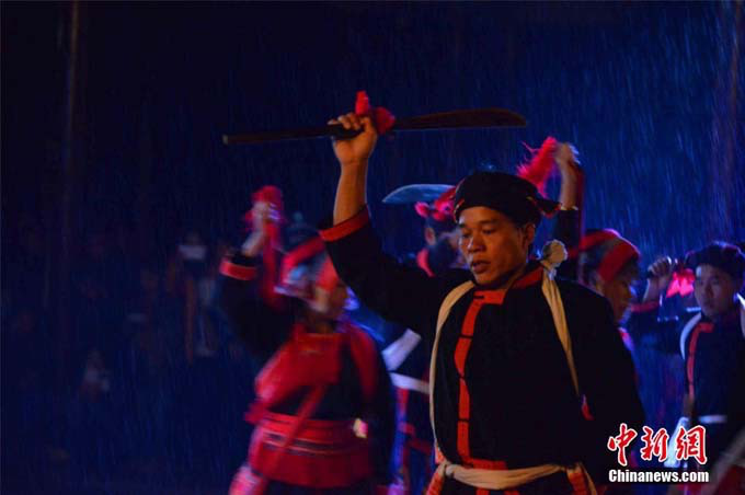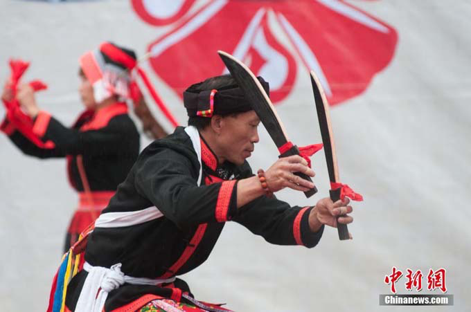 12月6日,在中國瑤族之鄉廣西金秀瑤族自治縣的盤王節上,當地瑤族百姓在跳”刀舞”