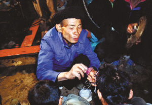 這天,我們剛好在縣里采訪,聽說高良鄉瑤族村寨要舉行度戒活動,于是就直奔瑤寨而去。一進寨子,馬上感覺氣氛不同?,幾鍕D女們頭戴別致的大銀盤,身著盛裝,真像過節一樣。經了解后,得知寨子里共有十幾個男孩要參加這次度戒。寨子里的一位老人告訴我們,一般情況下,只是兩三人,這樣多的男孩一同舉行度戒儀式是很難碰到的??磥?,我們的運氣還真不錯。我們來到度戒地點,見到將要度戒的十幾個男孩集中在一起,用棉被蒙著頭,不能見陽光,要等儀式完后,才能見陽光。