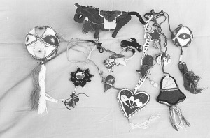 白族荷包制作精美,這些裝有中草藥和香料的荷包,具有驅蚊、逐蠅和殺菌等作用,被人們稱之為“香荷包”。它的制作方法很簡單:先用布殼剪出所要的心型,再用彩布依布殼剪出外套,并在上面繡上圖案,用彩線縫合成荷包,最后系線和縫綴瓔珞而成。制作香荷包的用料有:綢緞、紗、絨等,還有金銀彩線,彩紙,珠子,鏡片,馬尾及芳香類中草藥。一件上檔次的香荷包,要經過制芯、剪樣、刺繡(即雙針穿線對繡的堆繡、挑繡技法)、貼底、盤金、縫合、絞邊、寒蕊、穿珠、系絳、勾勒等多道工序。