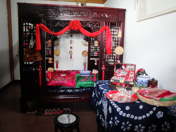 白族婚禮一般要舉行四天,第一天叫“預喜”,主要是殺豬宰羊,搭彩棚,迎喜神,接月老以及布置客堂、洞房和貼對聯等。第二天為“正喜”,嗩吶高奏,鑼鼓喧天,或騎馬或坐轎,迎親隊伍浩浩蕩蕩到女方家迎新娘,在完成了一系列妙趣橫生的禮儀后,經媒人再三催請后,新娘才依依不舍,由其親兄長背出門。新娘迎出門外后,新姑爺還要專門返回給丈母娘磕頭拜別,意為“回馬謝親”。新娘進門時要跨火盆或馬鞍,表示興旺或平安,有人還要故意在火盆里灑上辣椒面,嗆得大家流淚,白語里“辣”叫“qil”,與“親”諧音,表示以后親親密密。新娘迎進門后,拜堂前要梳妝,即女子換頭禮,請年高婦女為新婦梳頭,先戴鳳冠,然后換成紗帕,腳踩裝滿糧食的斗,寓意五谷豐登,魁星踢斗。斗中擺一桿秤,寓意新娘心像秤一樣公平,對丈夫對父母一視同仁,又放置一把剪刀,表示新娘對愛情的忠貞不二。第三天回門。新娘清晨早起,在別人幫助下“收頭”,將頭發梳成高高的髻,作為成人的標志,然后由新郎陪同回娘家。新娘手中提著一籃糖果,有花生、瓜子、水果糖之類,路上遇到熟人和小孩,就抓給一把。這天新娘家要辦酒席招待女婿,女婿一一拜見岳家長輩,新婚夫婦當日返回男家。第四天酬客,折彩棚,招待幫忙的客人。