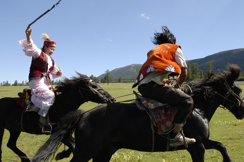 哈薩克族的民間體育活動(dòng)大多會(huì)在夏季牧場(chǎng),鮮花盛開之時(shí)舉行,許多體育活動(dòng)帶有濃厚的游牧文化特色,給人一種震撼人心之感。這些體育活動(dòng)不僅是一種健身方式,也是牧場(chǎng)上最受歡迎的娛樂(lè)活動(dòng)。很多時(shí)候,觀看者很難分清楚他們是在進(jìn)行體育競(jìng)技,還是在游戲。因?yàn)橛行╉?xiàng)目不僅表現(xiàn)出是他們的勇敢、聰明和機(jī)智,還表現(xiàn)出了他們剽悍、粗獷、豪邁的性格。經(jīng)過(guò)長(zhǎng)時(shí)間的發(fā)展,許多體育項(xiàng)目竟成了哈薩克族人民婚喪嫁娶、人生禮俗等喜慶活動(dòng)或重要場(chǎng)合的組成,同時(shí)也是兄弟民族共同的精神財(cái)富。