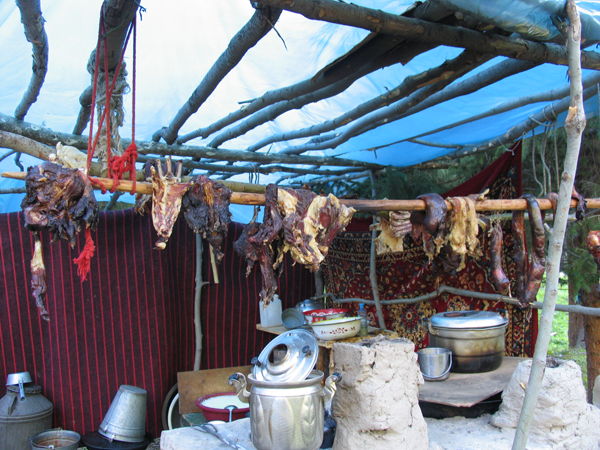 哈薩克民族以游牧為生,其主要的生產(chǎn)方式是畜牧業(yè),所以哈薩克族的飲食文化也與其生產(chǎn)方式息息相關(guān)。哈薩克族物質(zhì)生活與精神生活的方方面面都透露著畜牧業(yè)和草原游牧生活的濃郁氣息,例如大多數(shù)的哈薩克民族飲食都與畜產(chǎn)品肉、奶制品有關(guān)。牛、馬、綿羊(山羊)、駱駝等家畜的肉和奶是哈薩克民族飲食的主要原料。日常生活中他們的主要飲料是奶、“柯莫孜”(馬奶子)、“舒巴特”(駱駝奶)等。還有用乳汁為原料制作而成的酸奶疙瘩、奶酪、“蘇孜別”“葉吉蓋”“杰尼特”等食物非常美味。也就是說(shuō),以畜牧業(yè)為主的生產(chǎn)方式影響著哈薩克族人民生活的方方面面。奶類和肉類是日常生活的主要食物,面食是次要的食物,哈薩克族很少吃蔬菜。肉食主要有綿羊肉、山羊肉、牛肉、馬肉、駱駝肉,除此之外,還有野獸肉和野禽肉也是人們補(bǔ)充的肉食,其做法主要有煮、熏、烤三種。